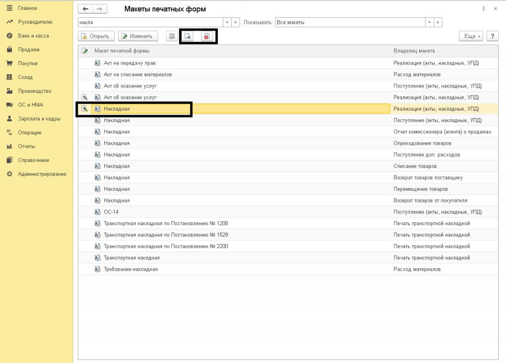 После сохранения макета, рядом появляется карандаш, который говорит о том, что макет изменялся. В случае, если нужно будет вернуться к исходному макету, нужно будет нажать на одну из кнопок в верхней части подраздела «Макеты печатных форм»: «Использовать стандартный макет», «Удалить измененный макет»