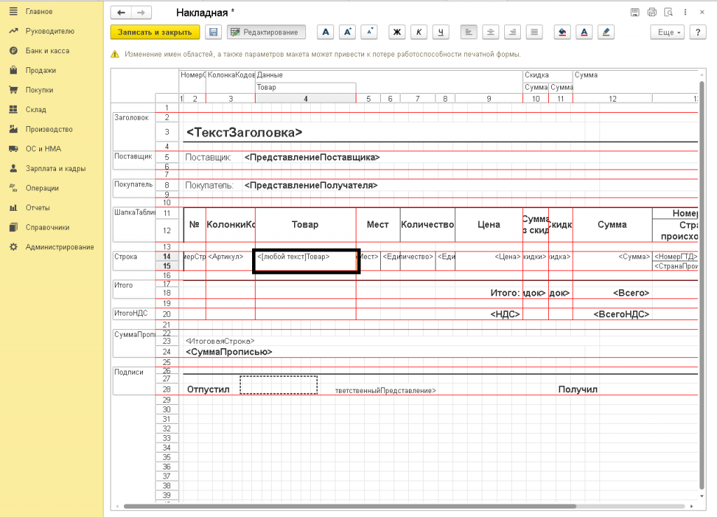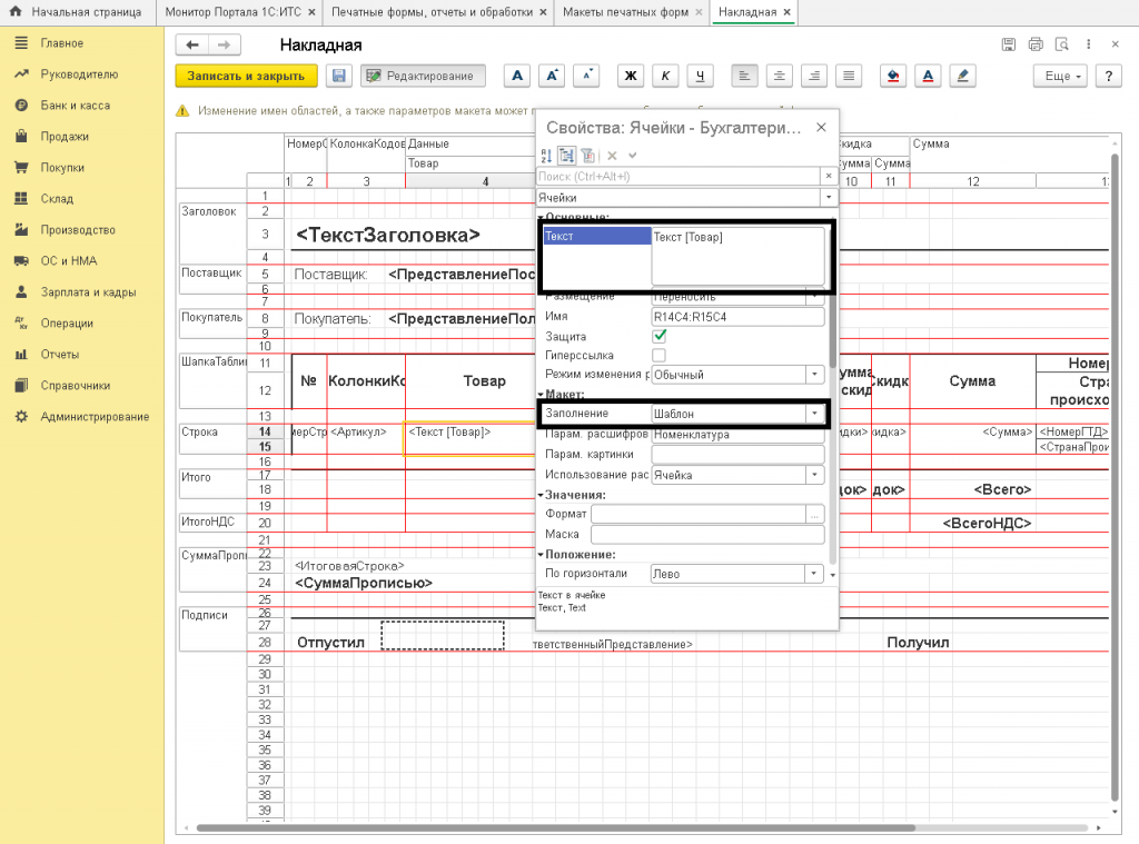 В макете печатной формы таким же образом можно добавить текст с форматированием. Оформление применяется для всей ячейки, следовательно, нельзя, используя шаблон, в одной ячейке применить сразу несколько вариантов форматирования.
