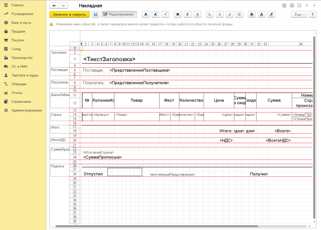 В качестве примера рассмотрим редактирование в программе Бухгалтерия предприятия 3.0 документа «Накладная» как другой макет. Для этого перейдем в раздел «Администрирование» - «Печатные формы, отчеты и обработки» - «Макеты печатных форм». Помимо текста, ячейки макета содержат имена параметров, которые заключены в скобки <>. Благодаря параметрам макета в нужную ячейку можно вводить необходимые данные, но не стоит забывать, что в модуле программы должно быть указаны значение параметра.
