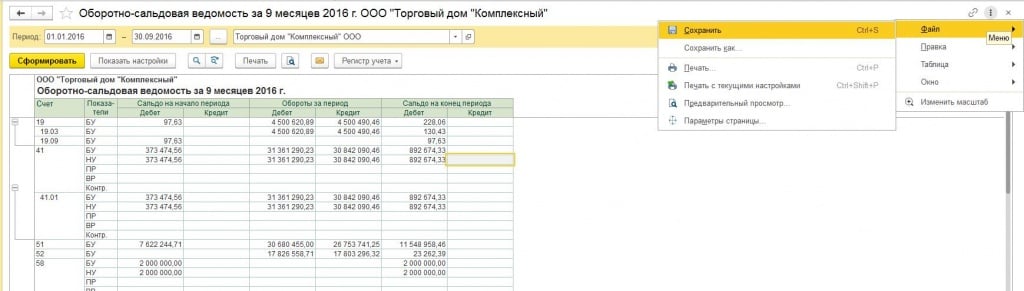 Что касается сохранение отчетов и печатных форм, то обращаемся теперь к изображению в виде трех точек (это меню) над кнопкой «Еще» и выбираем нужную нам опцию. Если сохранить или вывести на печать, то «Файл» и далее, что нам требуется.