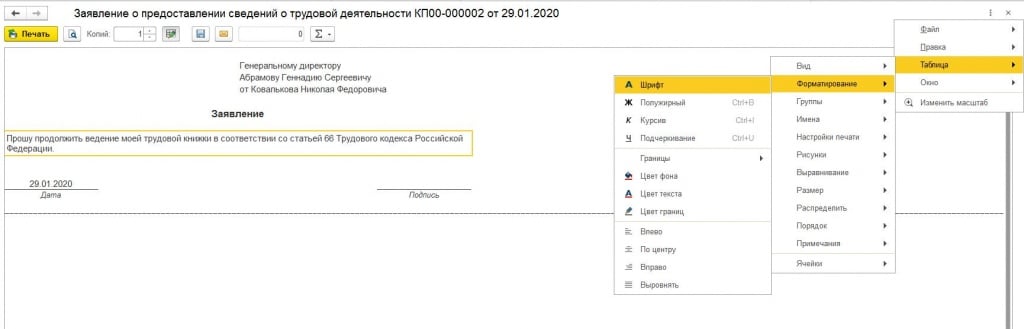 В случае с редактированием печатной формы аналогично нажимаем на меню, напоминаю это изображение в виде трех точек в углу над кнопкой «Еще». Потом выбираем «Таблица» и «Форматирование», в итоге можем менять шрифт, цвет, фон и т. д.