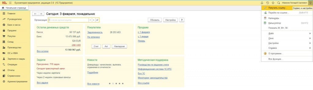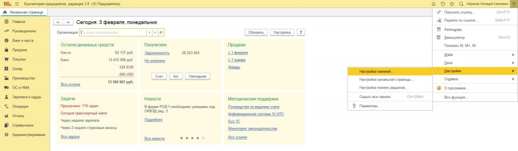 На линию консультации участились вопросы пользователей о том, что теперь на новых платформах 8.3.15 и 8.3.16 не могут найти функции по работе с файлами, а также настройки панелей и «Все функции». Эти вопросы, конечно, не без причины, ведь интерфейс программы действительно изменился. Нет привычного «Главного меню» рядом со значком «1С», теперь это «Сервис и настройки» и находится в другом углу.