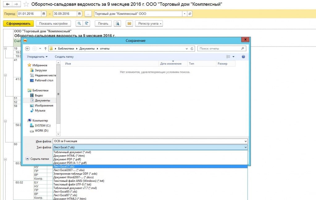 Например, отчеты удобно сохранять в формате xls. Нажимаем «Сохранить как» и не забываем выбрать нужный тип файла. Указываем путь, где сохраним отчет. Допусти это специальная папка с отчетами в документах.
