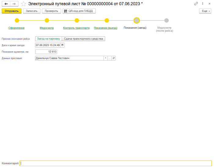В данном разделе ответственный сотрудник указывает признак окончания рейса, дату и время заезда, показания одометра. После указания всех данных нажимает кнопку «Отправить» и если требуется еще послерейсовый медосмотр, то будет титул – 6, который заполняется аналогично титулу – 2, в противном случае – формирование электронного путевого листа будет завершено.