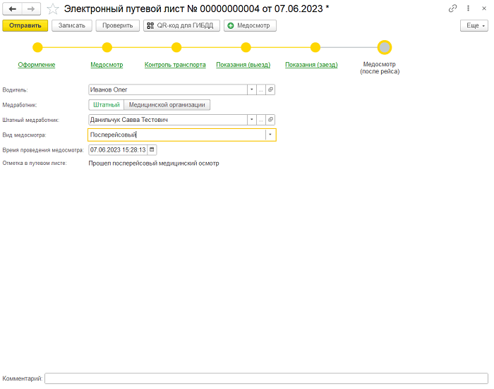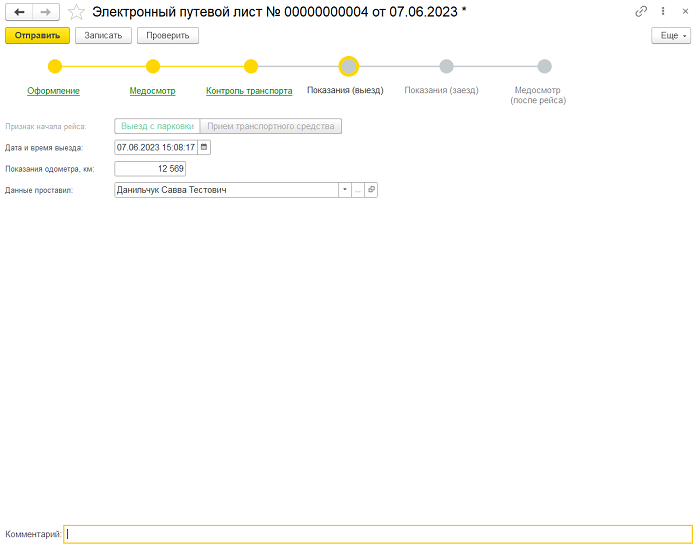 Медосмотр, технический контроль транспорта и внесение показаний одометра может сделано штатным сотрудником или сторонней организацией. Если указываются сторонние организации, то должно быть настроено ЭДО с ними, т.к. заполнять и подписывать данные пункты будут они.