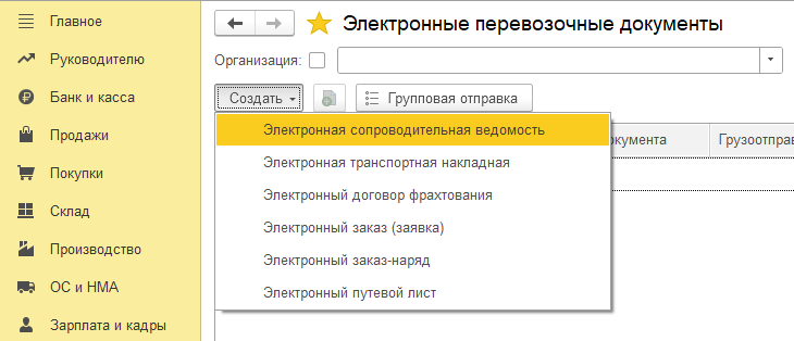 Заходим в данный раздел и нажимаем кнопку «Создать», выбираем нужный документ. В нашем случае это «Электронный путевой лист».