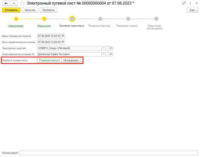 В данном титуле ответственный сотрудник за состояние транспортного средства указывает время проведения контроля, дату и время выпуска на линию, а также ставит отметку разрешен выпуск или нет. После заполнения отправляет титул.