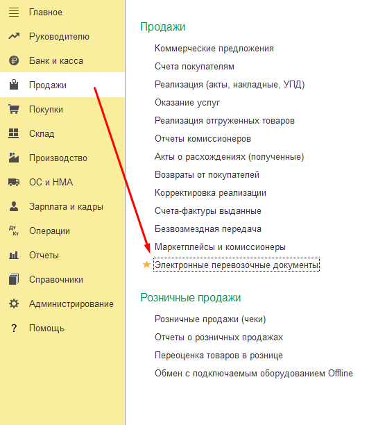 Все электронные перевозочные документы оформляются в разделе «Продажи» -> «Электронные перевозочные документы».