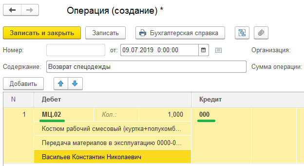 Рассмотрим первый вариант, когда на дату увольнения срок использования спецодежды истек, но спецодежда не списана и числится за сотрудником на забалансовом счете МЦ.02. В таком случае возврат спецодежды оформляется ручной операцией Дт МЦ.02 – Кт 000.