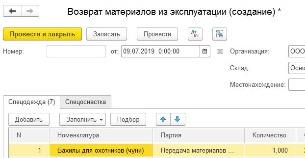 Третий вариант, когда срок эксплуатации одежды не закончился и сотрудник возвращает спецодежду, мы делаем Возврат материалов из эксплуатации