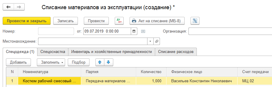 Если с передачей спецодежды сотрудникам обычно проблем не возникает, то в ситуации с возвратом или списанием могут возникнуть спорные вопросы. Дополнительно усложним задачу и рассмотрим случай при увольнении сотрудника, срок использования спецодежды не более 12 месяцев.