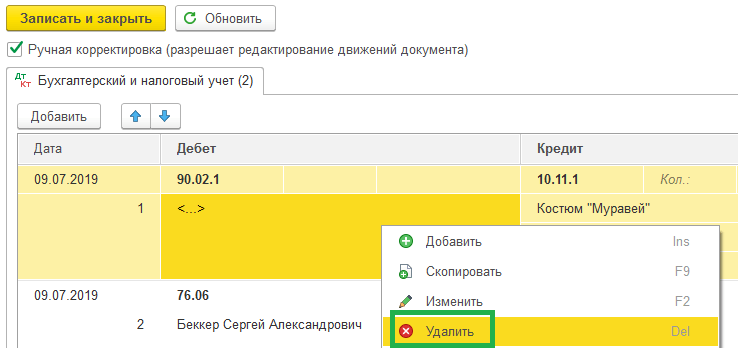 Т.к. в документе Списание материалов из эксплуатации будет сформирована проводка по кредиту 10.11.1, то в документе Реализация (акты, накладные) проводку по списанию материалов со счета 10.11.1 нужно удалить. Для этого нажмите кнопку ДтКт, установите флажок "Ручная корректировка" и правой кнопкой мыши на проводке Дт 91.02 и Кт 10.11.1 выберите "Удалить".