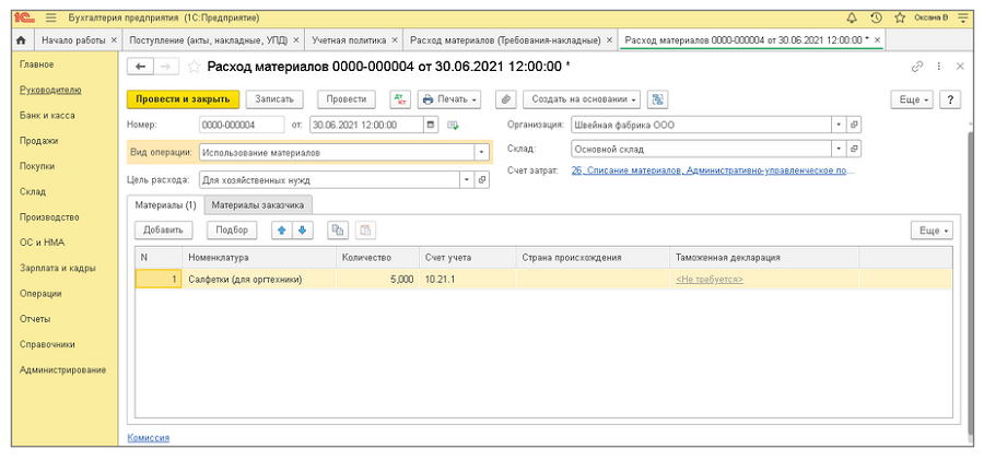 Для того, чтобы отразить передачу материалов в эксплуатацию, следует ввести документ «Расход материалов».