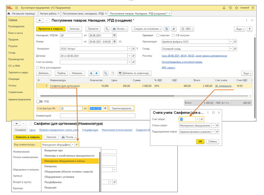 в колонке Номенклатура следует выбрать приобретенные для управленческих нужд материалы (при создании номенклатуры нужно выбрать вид номенклатуры "Малоценное оборудование и запасы");