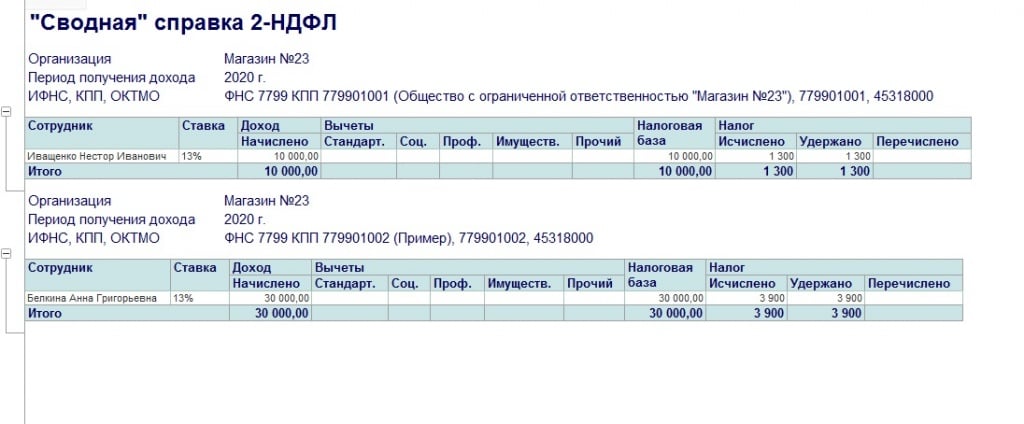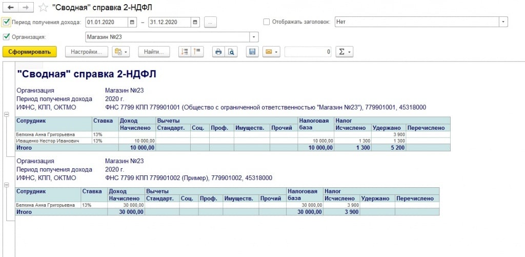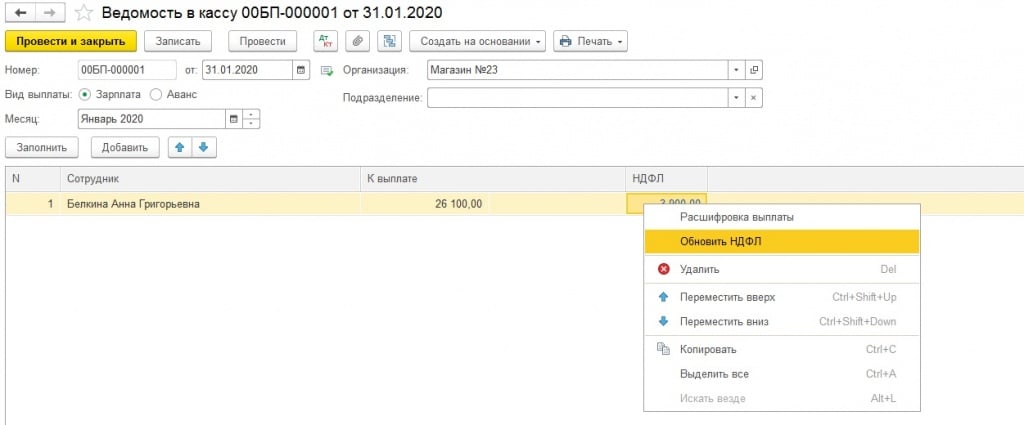 Для анализа воспользовались стандартным отчетом «Сводная» справка 2-НДФЛ. Как видим начисленный доход и исчисленный налог перешел в нужную налоговую, а вот удержанный остался за старой. Чтобы все данные изменились корректно, требуется ведомость на выплату зарплаты либо перезаполнить, тогда перед этой процедурой нужно сам документ выплаты распровести (Выдача наличных или Списание с расчетного счета), либо просто в ней по правой кнопки мыши обновляем налог. Этот вариант более удобен, так как не требуется распроводить документ выплаты.Затем обновляем налог конкретно по сотруднику, по которому произошли изменения.