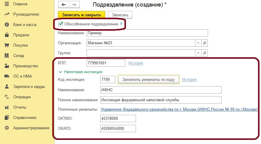 Когда флажок установлен, то при создании подразделения появляется новая отметка, которая позволяет дать подразделению статус обособленного и заполнить информацию по налоговой инспекции. В случае, если подразделения были ранее заведены в информационной базе, то нужно зайти в существующее подразделение и аналогично настроить.