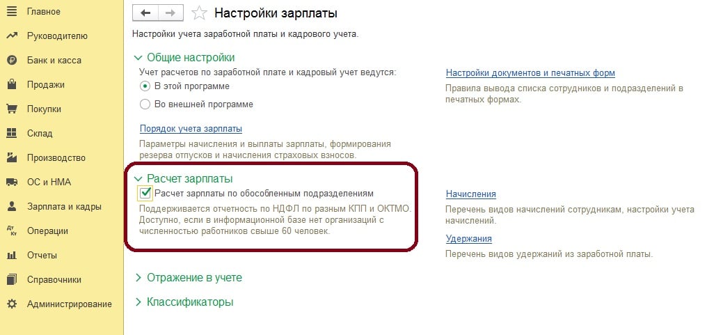 Предположим, что требуется формировать отчетность по НДФЛ по разным КПП и ОКТМО. Это функция доступна в программе "1С: Бухгалтерия предприятия", если численность сотрудников не превышает 60 человек. В основном, если количество сотрудников больше, то и учет зарплаты уже ведется в специализированных программах. Поэтому настройка актуальна для организаций с небольшим штатом сотрудников, но в своей структуре имеющих обособленные подразделения.