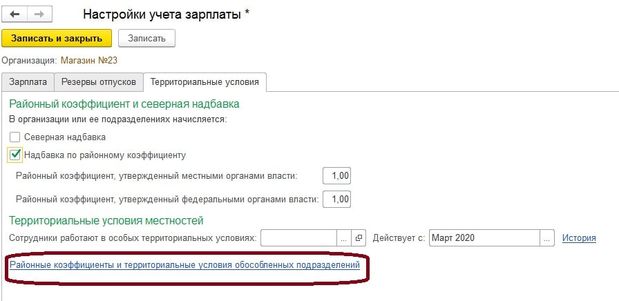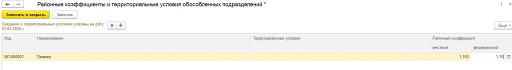 В открывшемся окне мы увидим все обособленные подразделения и можем по каждому назначить нужный нам районный коэффициент и по необходимости территориальные условия.
