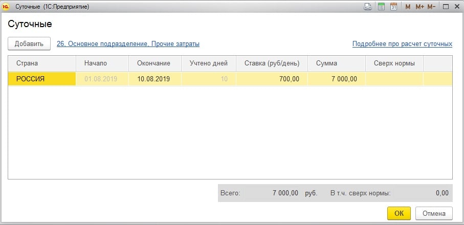 Поэтому, если эта была единственная причина, по которой вы не пользовались данным документом, то теперь при выборе документа не сомневайтесь и выбирайте новую форму. Ведь у него есть преимущества, например, вы вводите период командировки и автоматически рассчитываются суточные, исходя из нормы. По гиперссылке «Суточные» открывается форма, где вы можете изменить размер суточных при необходимости: