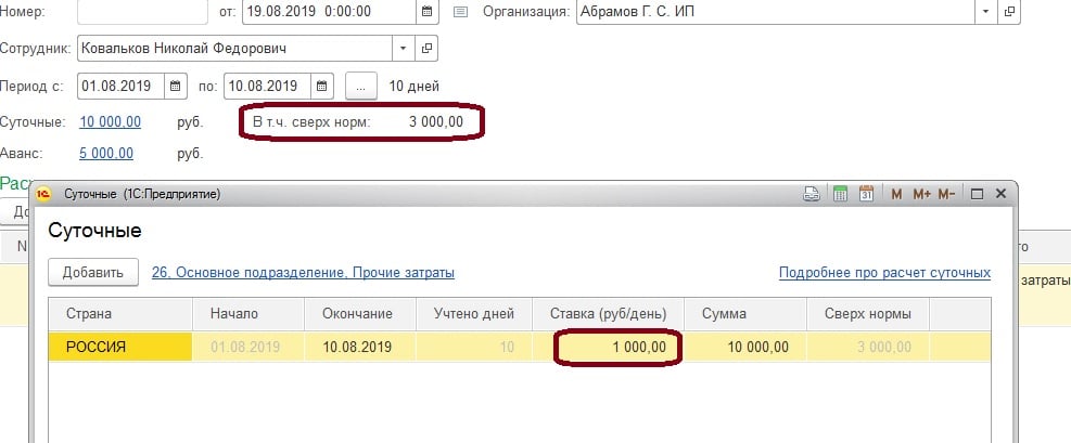 И если норматив суточных будет превышен, допустим, увеличили ставку на 300 рублей, то в документе рядом с суточными увидим сумму, которая облагается НДФЛ и страховыми взносами. Но, конечно, программа автоматически их не рассчитает, для этого нужно внести специальный документ: