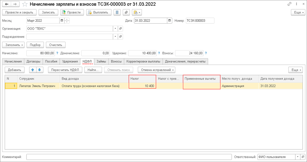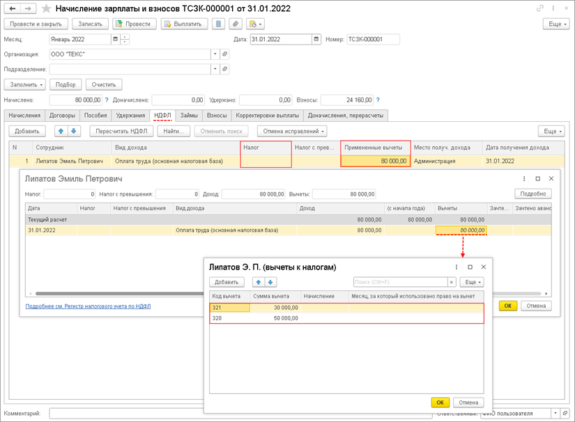 В нашем примере при начислении зарплаты за месяц с помощью документа “Начисление зарплаты и взносов” налог исчислен с учетом социальных налоговых вычетов. Доход сотрудника за январь 2022 г. составляет 80 000 руб.