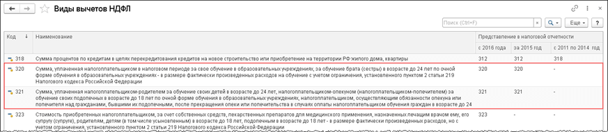 В справочнике “Виды вычетов НДФЛ” социальному вычету в сумме, уплаченной за свое обучение, соответствует код 320, за обучение своего ребенка - код 321.