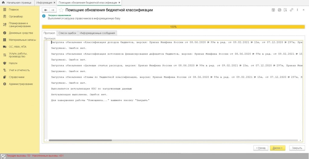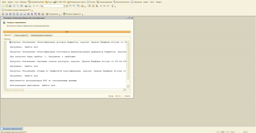 При нажатии кнопки Далее происходит загрузка обновленной бюджетной классификации в информационную базу, если флажок Выполнить тест загрузки снят, или только тестирование загрузки, если флажок Выполнить тест загрузки установлен.