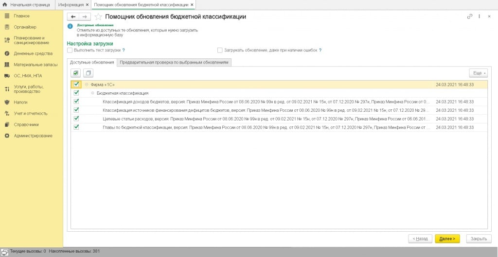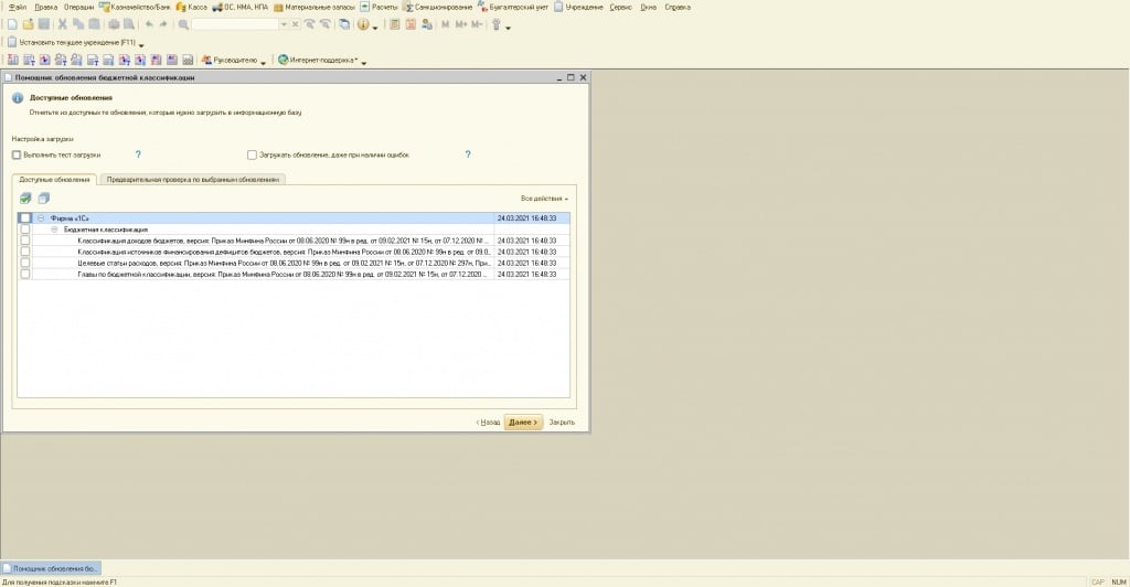 Если по указанному адресу был найден файл с классификаторами, Помощник предложит выбрать, какие именно классификаторы следует загрузить.