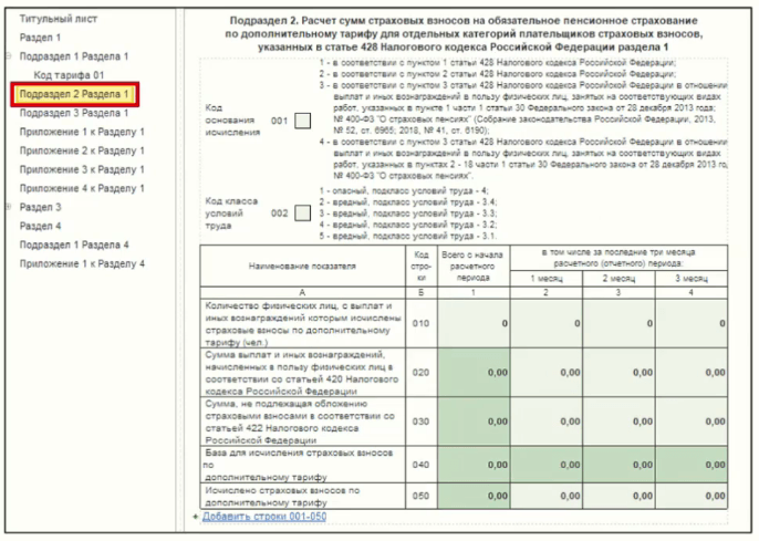 Расчет взносов на обязательное пенсионное страхование по дополнительным тарифам для лиц, имеющих право на досрочную пенсию, отражаются в подразделе 2 к разделу 1.