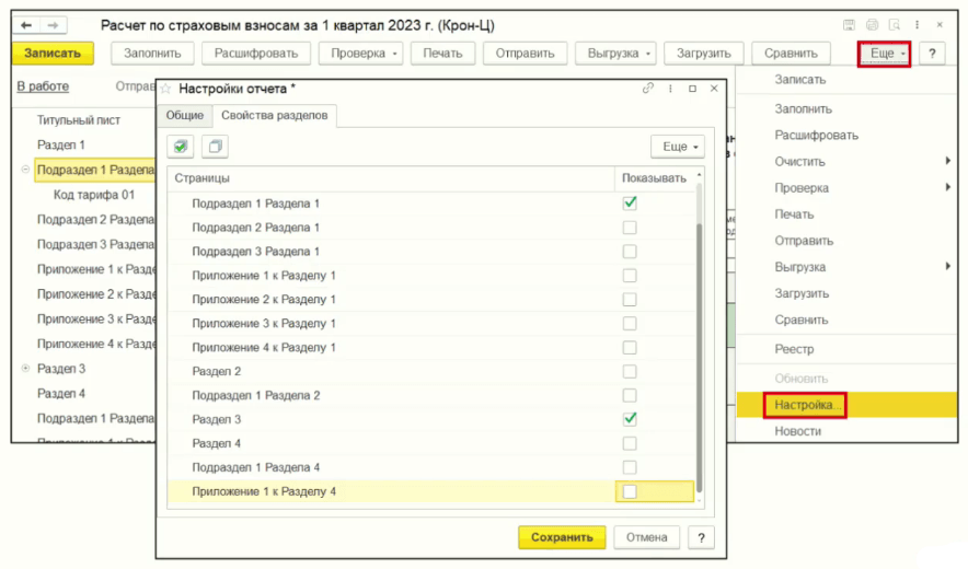 Видимость разделов формы можно регулировать. Для этого необходимо перейти в пункт меню Еще – Настройка.